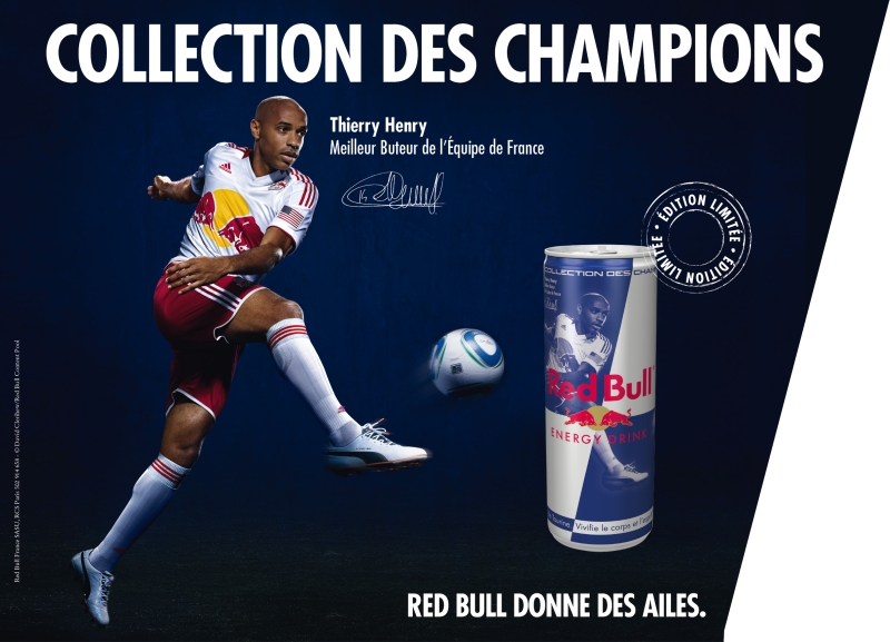 Red Bull Collection des Champions Thiery Henry naopak představuje slavného francouzského fotbalistu Thiery Henryho, který s reprezentačním týmem Francie získal evropský i světový mistrovský titul. Za svou profesionální kariéru hrál za AS Monako, Juventus Turín, Arsenal FC, FC Barcelonou a od roku 2010 za Red Bull New York, což je právě ona spojnice mezi ním a Red Bullem. No proč ne, zaslouží si to oba a sběratelé jsou potěšeni.